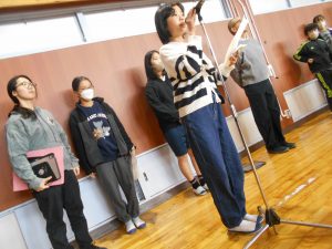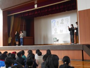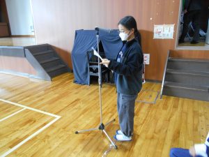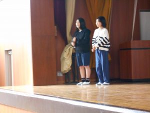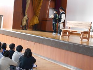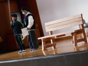 「みんなの心のこもったお手紙ありがとう。わたしは長い間、みんなが入学するずっと前から、暑い日も、雨の日も、ただ静かに、東栄小学校のみんなを守ってきたんだよ。・・・わたしの幹は笛やベンチに姿を変えて東栄小学校のみんなを見守っているよ。今まで本当にありがとう。これからもよろしくね。 東栄小学校のシンボル メタセコイアより」緑化委員の児童から切り倒されたメタセコイアからの手紙が読み上げられ、笛とベンチが紹介されました。笛は児童一人ひとりに配付され、5台のベンチはこだまホールや図書室に設置されます。後半は、児童会企画の「誰でしょう クイズ!」や「なぞなぞクイズ」で大いに盛り上がりました。