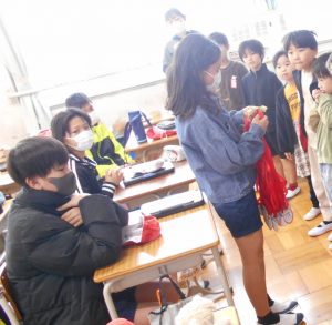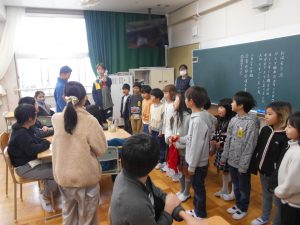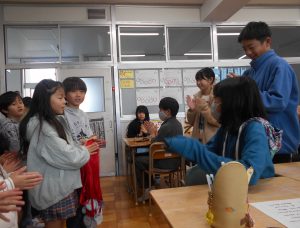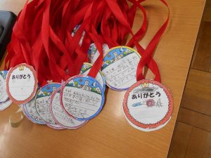 「明日の6年生を送る会で、このメダルをかけてください。」1年生児童から6年生児童に感謝のメダルが贈られました。メダルには「そつぎょうおめでとう」「いっしょにあそんでくれてありがとう」「中がっこうでもがんばってね」など、心温まるメッセージが記されていました。朝の準備を手伝ってくれたり、けがをしたときには保健室まで連れて行ってくれたり、放課に一緒に遊んでくれたりした6年生に感謝の気持ちが届けられました。