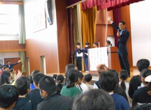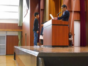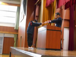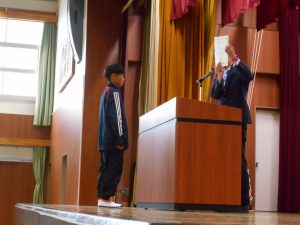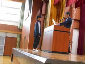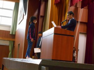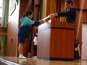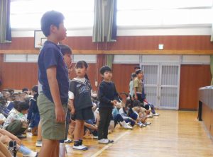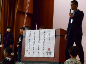 「東栄小学校が益々よくなります。認証されたみなさん、がんばってくださいね!」と、校長先生からの言葉。前期児童会役員、委員長、代表委員、学級委員の認証が行われました。児童会長、生活委員長、6年代表委員、4年学級委員の代表児童4名が立派な姿で認証状を受け取りました。最後には、全校児童で「ありがとうの花」を歌って、代表児童にエールを送りました。学級や学年、学校の中心となって活躍してくれることを期待しています。