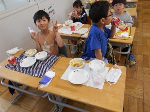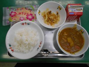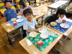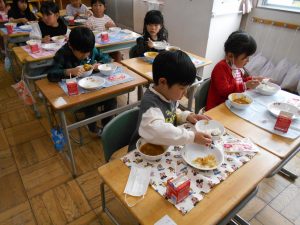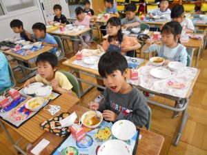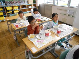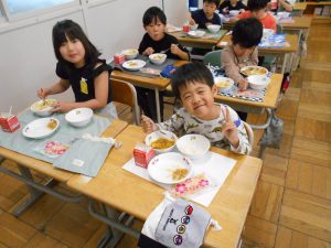 「カレー、おいしい!おかわりしたい!」「クレープは カレーをぜんぶたべてからにする」「やさいも がんばっていっしょにたべる」1年生児童にとって小学校での初めての給食。献立は、カレーライス、福神漬サラダ、牛乳、入学お祝いクレープ。クラスのみんなと一緒に給食を味わいました。食べて、感じて、味わってたくさんのことを学びましょう。