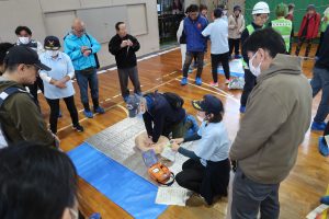 子どもたちも多く参加し、体験を通して命を守る行動について学びました。AED体験では真剣な表情で取り組む姿が見られ、担架づくりや煙道体験では地域の方と協力する姿もありました。