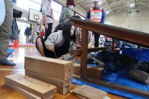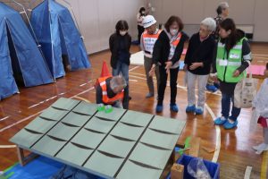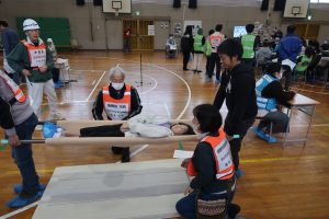 屋外での活動はできませんでしたが、指定避難所である瑞鳳小学校を会場に、AED・胸骨圧迫訓練、車いす体験、物干しざおと毛布を使った担架体験など、さまざまな防災体験を行いました。