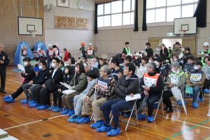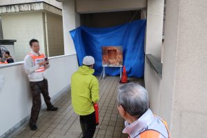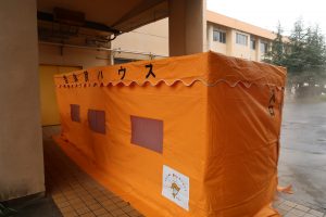 午前9時に各町の一時避難場所に集合し、町ごとに小学校へ移動。渡り廊下では煙道体験も行い、災害時の避難の大切さを実感することができました。