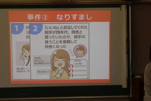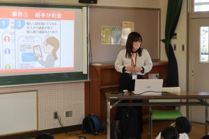 授業では、親しくしていたオンライン上の友達が突然態度を変える事例や、なりすましによるトラブルの事例を通して、インターネット上で気をつけるべきことを考えました。