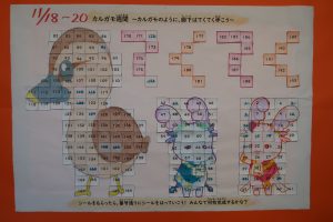 子どもたちは、正しく歩くことができるとシールを受け取り、職員室前に掲示されたカルガモの親子や本校のマスコットキャラクターの絵に貼っていきます。日に日にシールが増え、絵柄がどんどん鮮やかに浮かび上がってきました。
