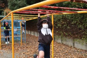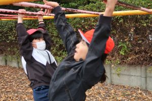子どもたちは、雲梯を使って「じゃんけん遊び」に挑戦していました。腕の力でしっかりと体を支えながら、口で「じゃんけんぽん!」。どの子も真剣な表情で、工夫しながら楽しんでいました。