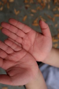 ゲームが終わると、「先生、見て!」と駆け寄ってくる声。手のひらを見ると、がんばってぶら下がっていたため、みんなのお手々が真っ赤に。