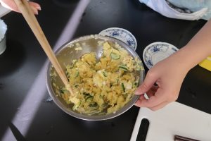 調理室からは、調理中のとてもおいしそうな香りが漂い、子どもたちは仕上がった料理を嬉しそうに見せ合っていました。自分で考え、手を動かしてつくることで、食への関心もさらに高まったようです。