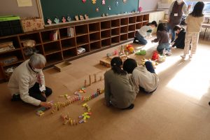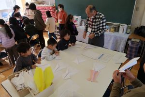 会場では、地域の皆さまにご協力いただき、折り紙づくりや積み木遊び、紙細工づくり、紙ヒコーキ飛ばしなど、子どもたちが自由に楽しめる活動が用意されていました。児童たちは、地域の方と会話を交わしながら作品づくりに取り組んだり、完成した紙ヒコーキを一緒に飛ばしたりするなど、笑顔あふれる交流の姿が見られました。
