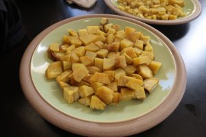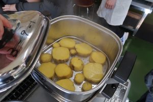 さくら学級・たんぽぽ学級・すみれ学級では、学習園で収穫したサツマイモを使って調理実習を行いました。今回は、サツマイモをふかし芋にし、ホットケーキミックスと混ぜてフライパンで焼く「サツマイモケーキ」作りに挑戦しました。