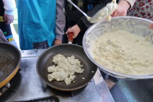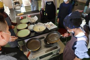 はじめに先生から、調理の手順や道具の使い方、安全に気を付けるポイントについて説明を受けました。子どもたちは一つ一つの話をよく聞き、確認しながら活動に取り組む姿が見られました。サツマイモをつぶしたり、生地を混ぜたり、フライパンで焼き色を確かめたりと、それぞれの工程で役割を意識し、手順を守って丁寧に作業を進めることができました。