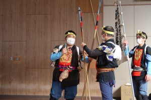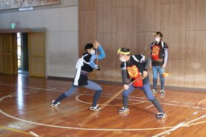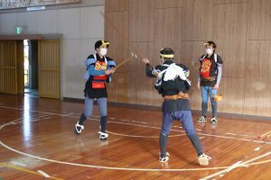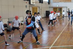 また、ほら貝の力強い音色とともに迫力ある模範演技を見せていただいた後には、大刀や棒を使った基本的な演技にも取り組みました。一つ一つの動きに集中し、仲間と息を合わせながら学ぶ姿から、伝統文化の奥深さと大切さを実感している様子がうかがえました。