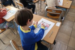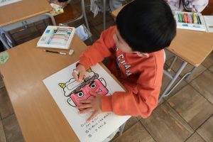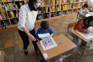 色塗りでは、はみ出さないように丁寧に色鉛筆を動かし、細かなところまで心を込めて仕上げる姿が見られました。入学して間もない頃から比べると、集中して作業に取り組む姿に、大きな成長を感じました。