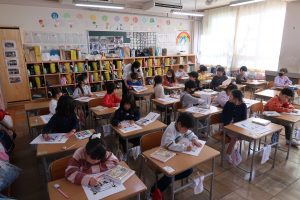 完成したお面を手に、友だち同士で見せ合いながら笑顔を交わす1年生の姿が、とても微笑ましいひとときとなりました。