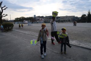 毎朝、生活委員会の先生が昇降口に立ち、あいさつ運動を行っています。大きなうちわには「おはようございます」の文字が書かれ、登校してくる子どもたちを明るく迎えています。