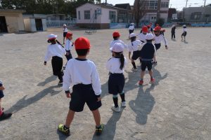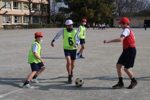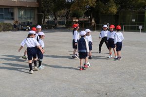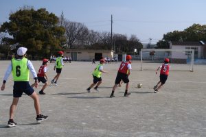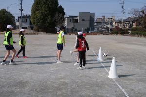 1年生は、輪っかを目印にしながら、ボールを一度しっかり止めてからキックする練習をしていました。ただ強く蹴るのではなく、「友達にちょうどよい力でパスを出す」ことを大切にした学習です。小さな体で一生懸命ボールを追いかけ、止めて、ねらって蹴る姿からは、基礎を丁寧に積み重ねていこうとする真剣さが伝わってきました。