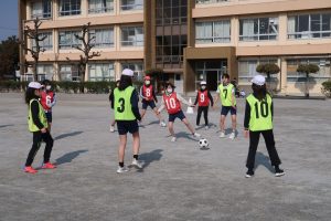 一方、6年生は男女に分かれてゲーム形式の学習。味方と声をかけ合いながらボールをつなぎ、空いたスペースを見つけてゴールへと運んでいきます。これまでに身に付けてきた技能を生かし、チームで戦術を考えながらプレーする姿は、さすが最高学年。仲間を信頼し合いながらゲームを楽しむ姿がとても頼もしく感じられました。