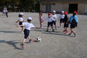 2時間目、運動場をのぞいてみると、1年生と6年生がそれぞれ体育でサッカーの学習に取り組んでいました。