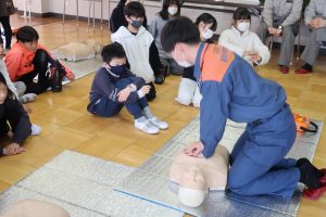 はじめに、「なぜ胸骨圧迫が必要なのか」「AEDはどのようなときに使うのか」といったお話を聞き、命を守る行動の大切さを学びました。その後、実際に人形を使って胸骨圧迫の体験を行いました。一定のリズムで、しっかりと力を込めて押し続けることの難しさを感じながらも、子どもたちは真剣な表情で取り組んでいました。