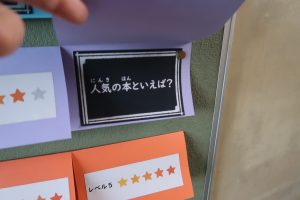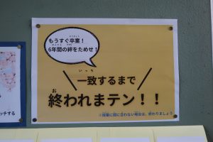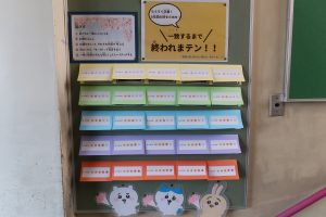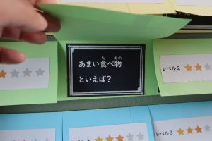 また、西階段の掲示板には「一致するまで終われまテン!!」のコーナーも登場。レベルに合わせて掲示をめくり、「あまい食べ物と言えば?」などの質問に友達同士で答えを出し合います。ぴったり一致すれば、ハイタッチ!友達との関わりの中で、考える力や伝える力も育まれています。