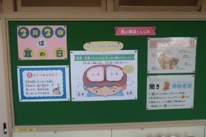 今月の保健室掲示板のテーマは「耳」。保健室前の掲示板も3月バージョンにリニューアルされました。