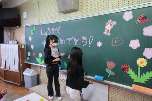 いよいよ1年生にとっては、小学校生活の大切な第一歩となる日を迎えます。その一日を大切にしようとする6年生の思いが、校内のあちこちにあふれており、温かくやさしい空気に包まれていました。