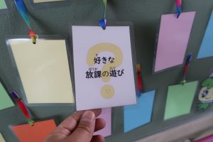 足を止めてカードをめくる子、友達と笑い合いながら答え合う子など、掲示の前には子ども達だけでなく職員の姿もあり、さっそく楽しそうな姿が見られました。