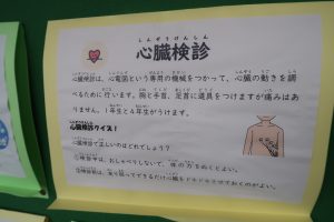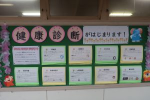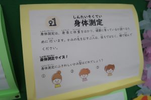 また保健室前の掲示板には、健康診断に関するクイズも掲示されています。自分の体について知る大切な機会である健康診断について、「どんなことが分かるのか」「どのように受けるのか」を、楽しみながら学べるよう工夫されています。