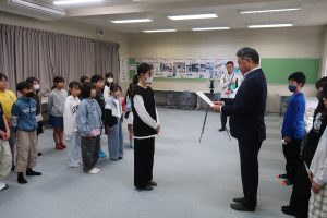 集会では、新年度の学級委員となった児童の認証を行いました。校長先生から認証状が手渡されると、その責任と誇りを感じ取ることができ、引き締まった表情が印象的でした。