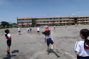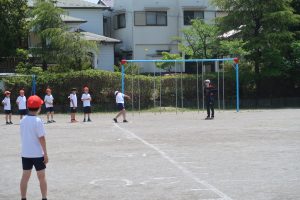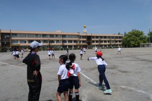 5年生が運動場でボール投げの練習に取り組んでいました。5月22日に予定されているスポーツテストに向けての活動です。