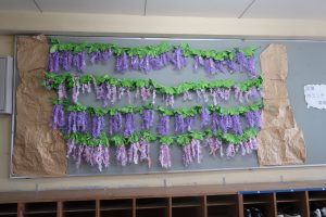 昇降口には、図書ボランティアの皆さんが掲示してくださった藤の花が、風に揺れて子どもたちを迎えています。まるで「おかえり」と声をかけてくれているような、温かい雰囲気に包まれています。